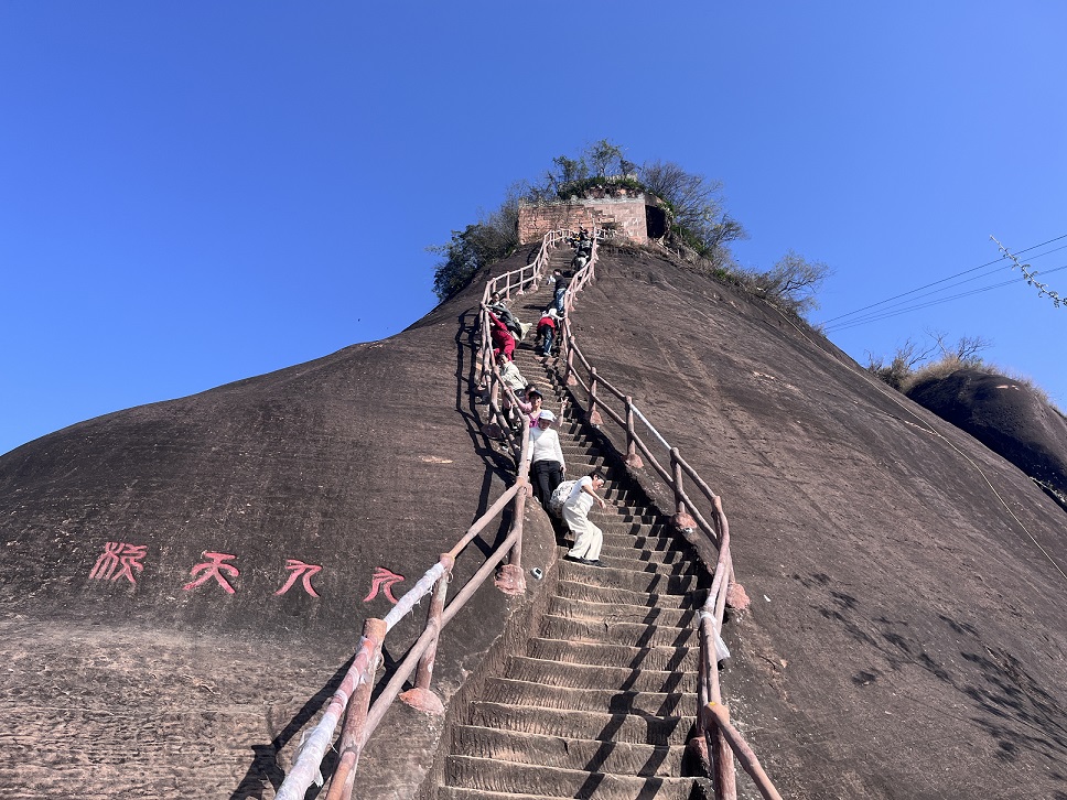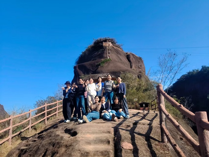 中午,团队在景区品尝当地特色午餐。午后,转赴云崖栈道,挑战著名的“九九天梯”。悬空栈道之上,俯瞰深谷幽涧,仰望红褐色岩壁在阳光下泛着温润光泽,众人无不惊叹于大自然的鬼斧神工。远山如黛,丹崖似火,美景令人流连,同事们纷纷驻足合影,将此刻定格为永恒记忆。一日行程虽短,却充实而温暖。我们不仅领略了世界自然遗产的雄奇壮美,更在并肩同行中加深了理解,增进了信任。
